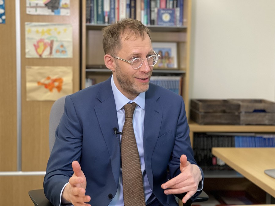 Daniel Leigh, who heads the World Economic Studies division in the Research Department of the International Monetary Fund (IMF), speaks in an interview with Xinhua during the IMF and World Bank Spring Meetings week in Washington, D.C., the United States, April 11, 2023. (Xinhua/Zhang Mocheng)