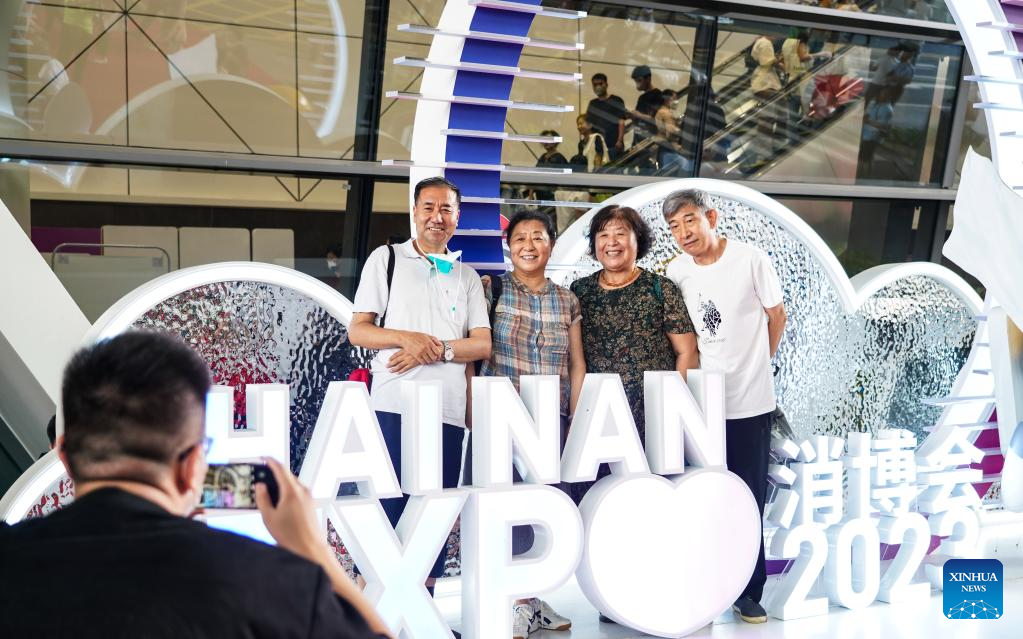 Visitors pose for a group photo at the third China International Consumer Products Expo (CICPE) in Haikou, capital city of south China's Hainan Province, on April 14, 2023. The expo opened to the public on Friday. (Xinhua/Fan Yuqing)