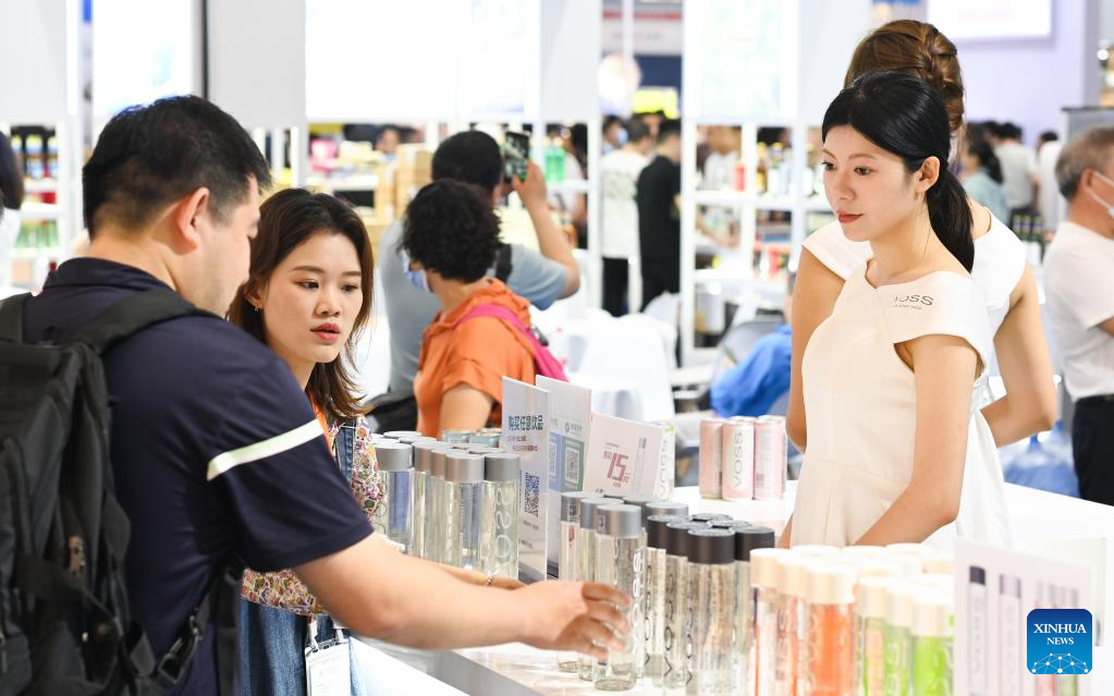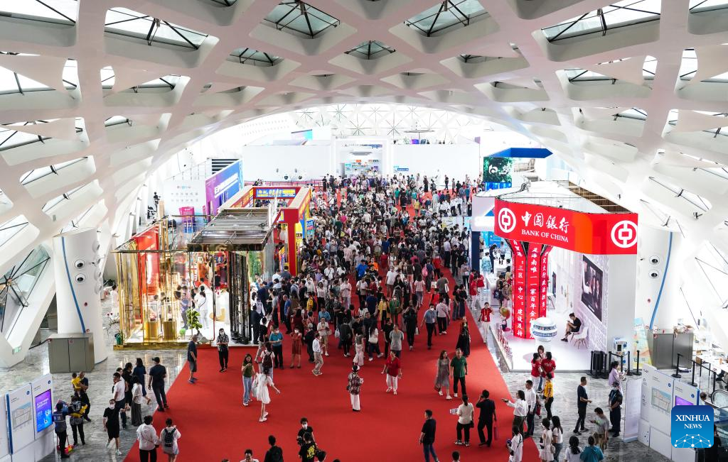 Visitors learn about exhibited products at the third China International Consumer Products Expo (CICPE) in Haikou, capital city of south China's Hainan Province, on April 14, 2023. The expo opened to the public on Friday. (Xinhua/Yang Guanyu)