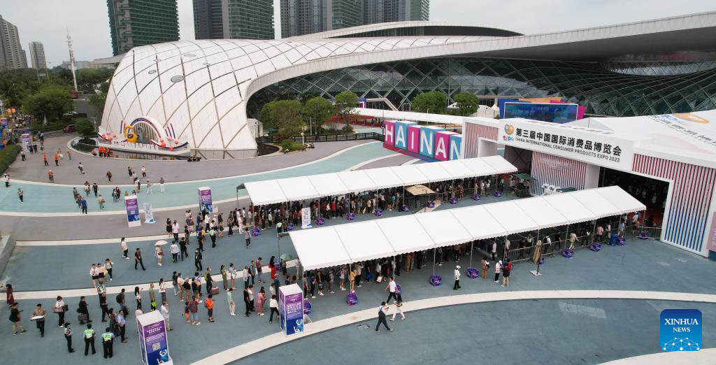 This aerial photo taken on April 14, 2023 shows people queuing up to visit the third China International Consumer Products Expo (CICPE) in Haikou, capital city of south China's Hainan Province. The expo opened to the public on Friday. (Xinhua/Yang Guanyu)