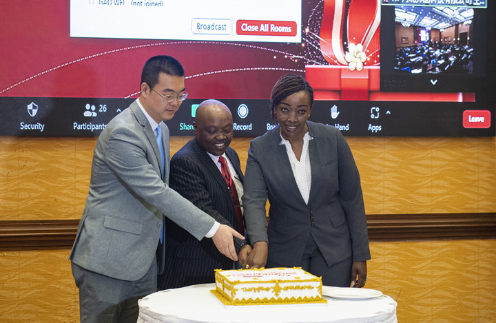 Guests cut a cake during a promotion forum for the upcoming 133rd China Import and Export Fair, also known as Canton Fair, in Nairobi, Kenya, on April 12, 2023. (Xinhua/Li Yahui)