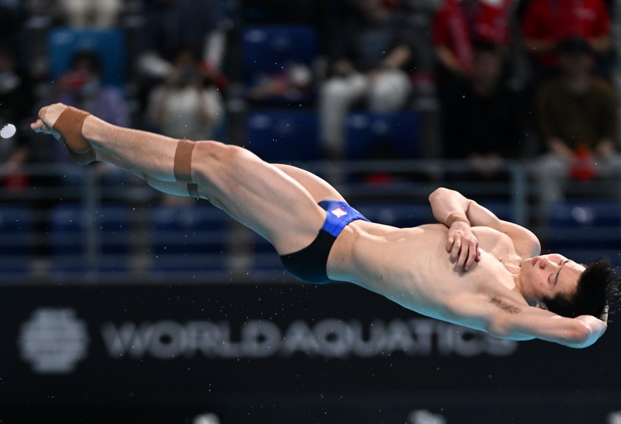 Wang, the first ever triple gold medalist at a single World Championships in 2022, snatched a highest score of 104.50 points for his last dive forward 4 1/4 somersaults and sealed his victory in 553.15, followed by Jack Laugher of Britain in 442.95 and Germany's Moritz Wesemann in 438.70.