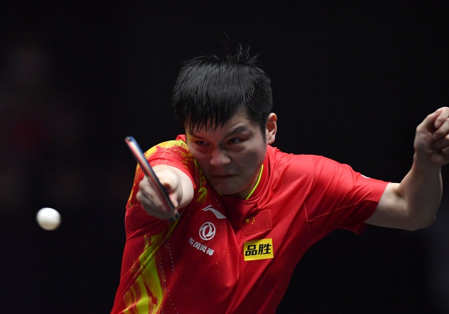 Fan Zhendong of China hits a return during the men's singles semifinal against Lim Jong-hoon of South Korea at the WTT Champions Xinxiang 2023 in Xinxiang, central China's Henan Province on April 14, 2023. (Xinhua/Li Jianan)