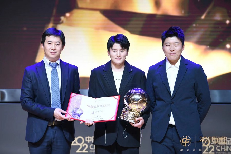 Wang Shanshan (M) receives the 2022 Chinese Women's Footballer of the Year award during the ceremony in Beijing on April 14, 2023.