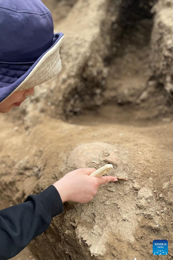 A staff member operates at Sanxingcun relic site in Jintan District of Changzhou, east China's Jiangsu Province, on April 13, 2023. A second excavation was launched on Saturday at a neolithic site in east China's Jiangsu Province, three decades after the first one, which unearthed more than 4,000 items. (Xinhua/Zhu Guoliang)