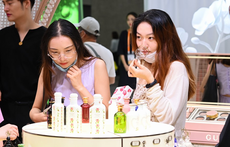 Visitors learn about exhibited products at the third China International Consumer Products Expo (CICPE) in Haikou, capital city of south China's Hainan Province, on April 14, 2023. (Xinhua/Yang Guanyu)