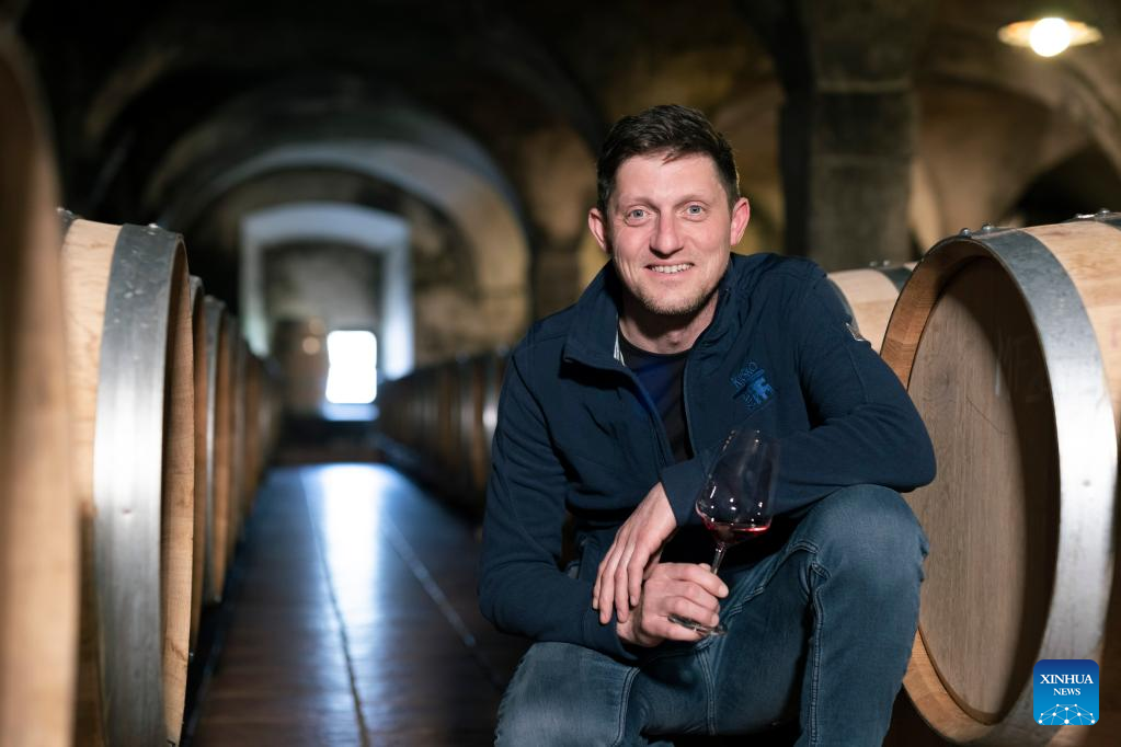 Jure Grubar, CEO of Klet Krsko Wine Cellar, speaks in an interview with Xinhua at the Klet Krsko (KK) Wine Cellar in Krsko, Slovenia, on April 4, 2023. Jure Grubar has lived with his father in their family vineyard since he was a toddler. Now a professional wine maker, he was appointed chief executive of the Klet Krsko (KK) Wine Cellar in 2019 and is responsible for the production of around 1.4 million liters of wine per year.(Photo by Zeljko Stevanic/Xinhua)
