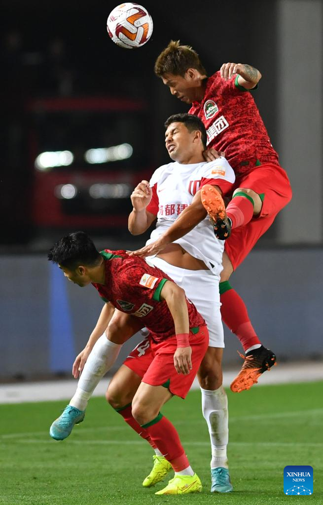 Ai Kesen (C) of Chengdu Rongcheng vies for a header during a 2023 season Chinese Football Association Super League (CSL) match between Henan SSLM and Chengdu Rongcheng in Zhengzhou, central China's Henan Province, April 16, 2023. (Xinhua/Li Jianan)