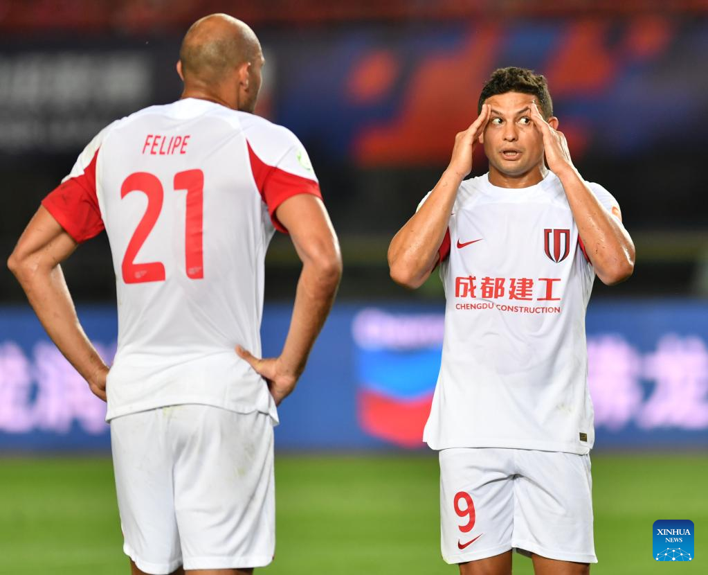 Ai Kesen (R) of Chengdu Rongcheng reacts during a 2023 season Chinese Football Association Super League (CSL) match between Henan SSLM and Chengdu Rongcheng in Zhengzhou, central China's Henan Province, April 16, 2023. (Xinhua/Li Jianan)