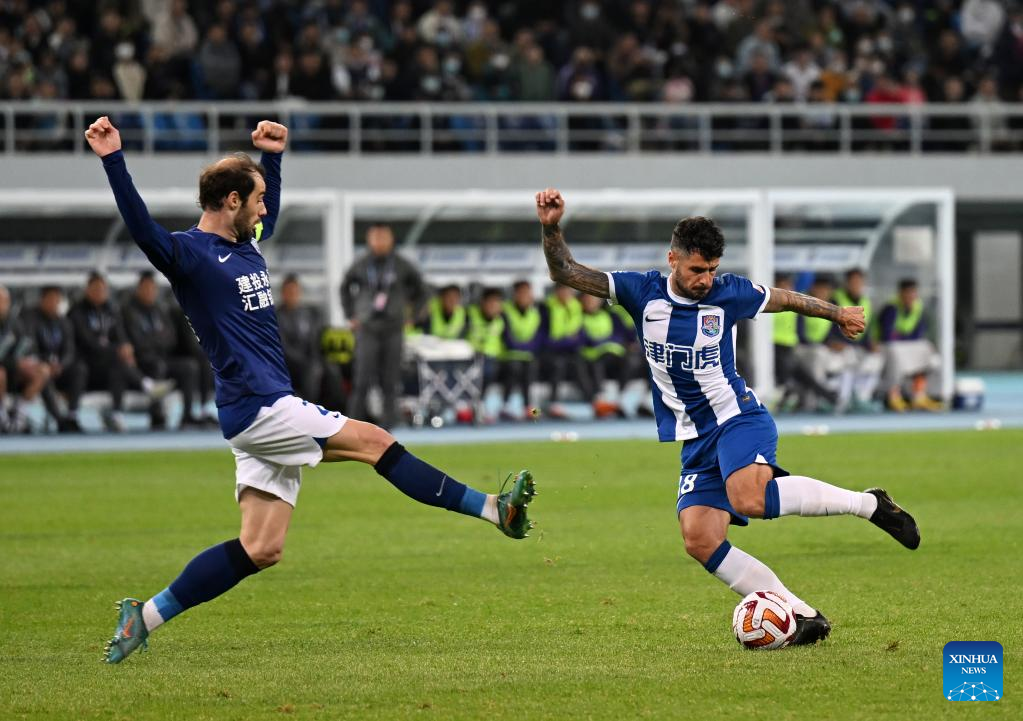 (230416) -- TIANJIN, April 16, 2023 (Xinhua) -- David Andujar (2nd L) of Tianjin Jinmen Tigers shoots during a 2023 season Chinese Football Association Super League (CSL) match between Tianjin Jinmen Tigers and Cangzhou Mighty Lions in north China's Tianjin, April 16, 2023. (Xinhua/Sun Fanyue)