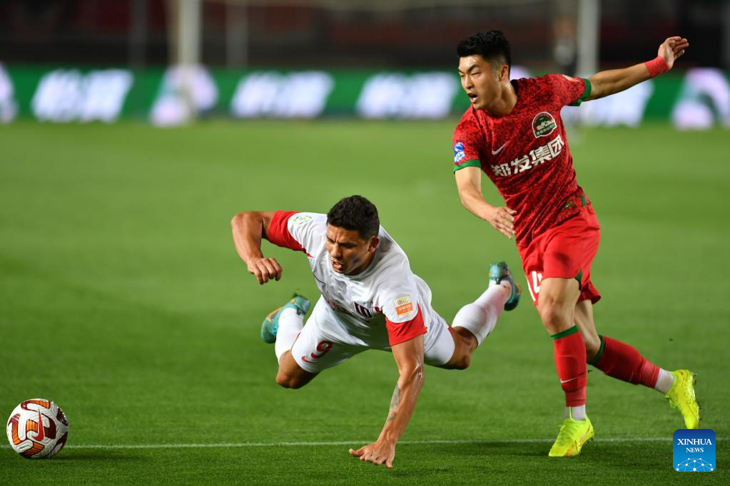 Ai Kesen (L) of Chengdu Rongcheng vies for the ball during a 2023 season Chinese Football Association Super League (CSL) match between Henan SSLM and Chengdu Rongcheng in Zhengzhou, central China's Henan Province, April 16, 2023. (Xinhua/Li Jianan)