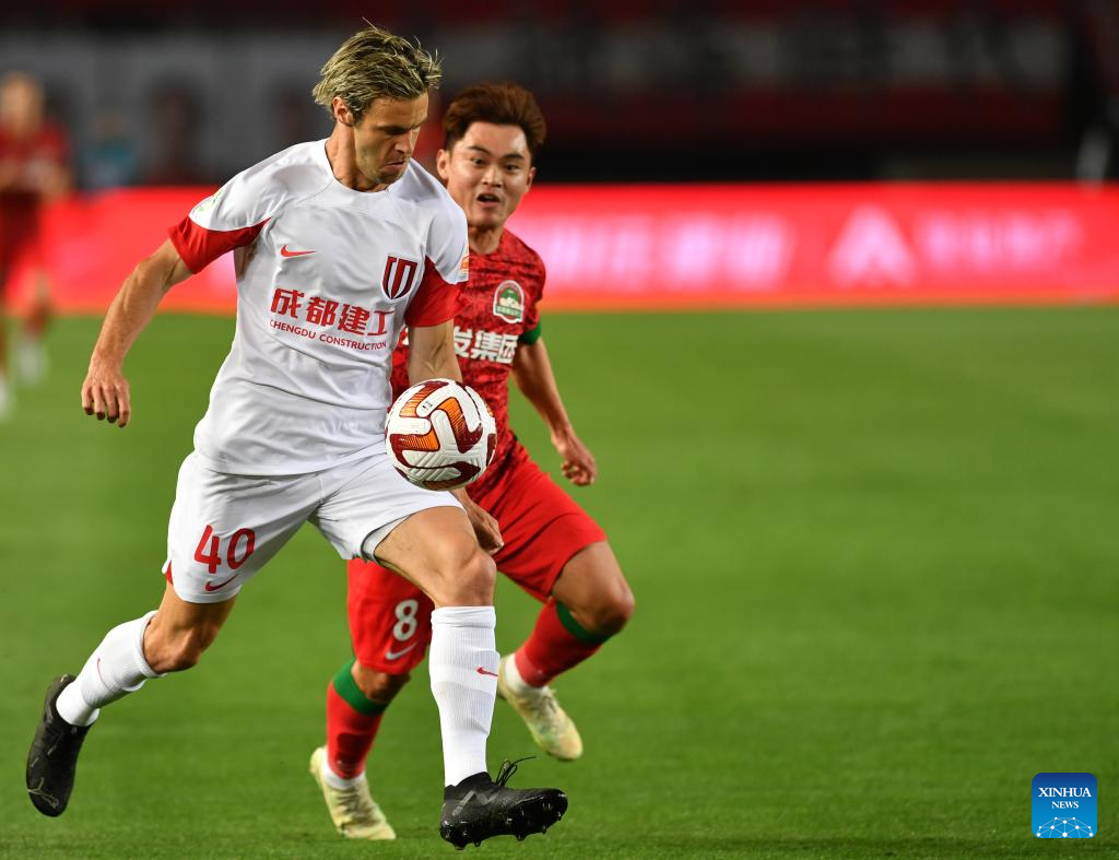 Richard Windbichler (L) of Chengdu Rongcheng vies for the ball during a 2023 season Chinese Football Association Super League (CSL) match between Henan SSLM and Chengdu Rongcheng in Zhengzhou, central China's Henan Province, April 16, 2023. (Xinhua/Li Jianan)