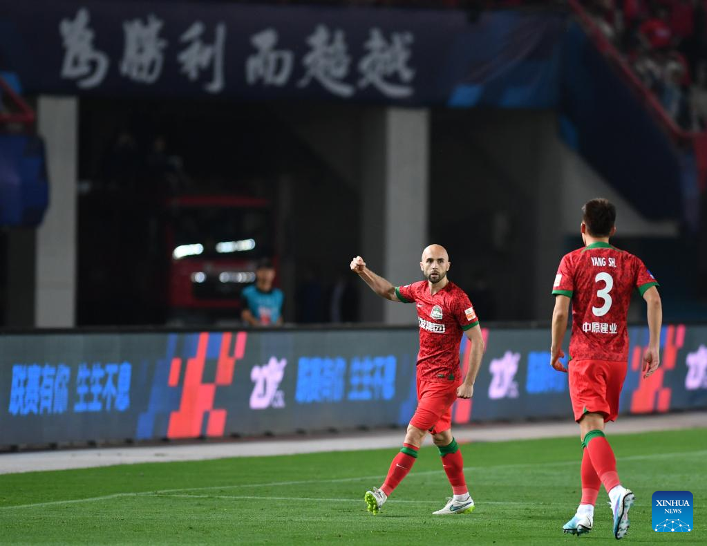 Adrian Mierzejewski (L) of Henan SSLM celebrates his goal during a 2023 season Chinese Football Association Super League (CSL) match between Henan SSLM and Chengdu Rongcheng in Zhengzhou, central China's Henan Province, April 16, 2023. (Xinhua/Li Jianan)