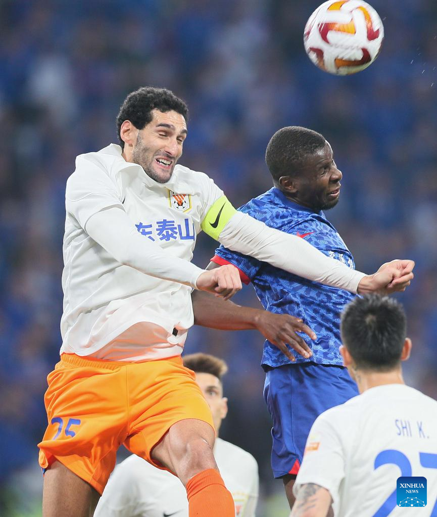 Marouane Fellaini (L) of Shandong Taishan vies for a header during a 2023 season Chinese Football Association Super League (CSL) match between Shandong Taishan and Shanghai Shenhua in east China's Shanghai, April 16, 2023. (Xinhua/Ding Ting)