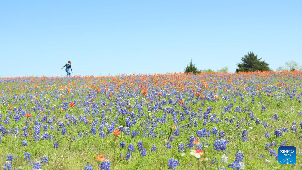 A woman walks at a wildflower meadow near Ennis, Texas, the United States, April 16, 2023. The 71st Annual Ennis Bluebonnet Trails Festival was held here from April 14 to 16. (Xinhua/Xu Jianmei)