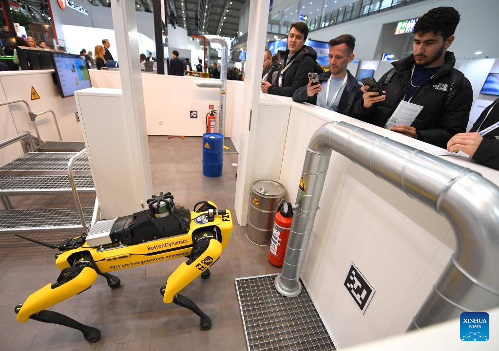 People look at an intelligent inspection robot dog during the Hannover Messe in Hannover, Germany, on April 18, 2023. Germany's leading trade fair for mechanical and electrical engineering kicked off on Monday in Hannover, with the theme of "Industrial Transformation - Making the Difference." (Xinhua/Ren Pengfei)