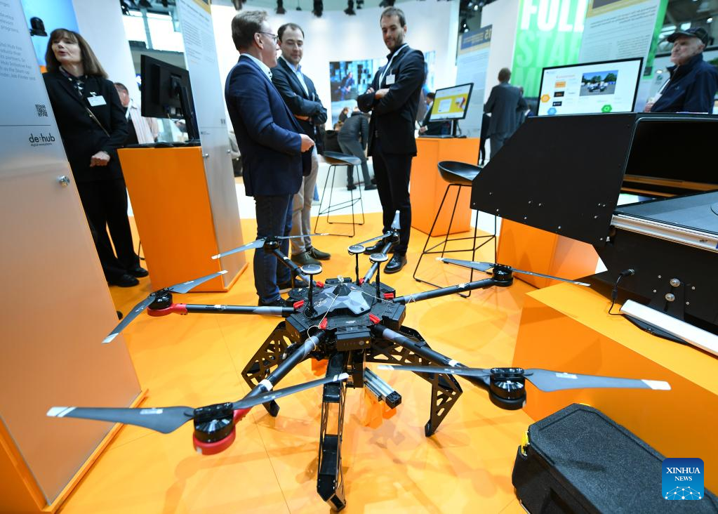 A transport drone is displayed during the Hannover Messe in Hannover, Germany, on April 18, 2023. Germany's leading trade fair for mechanical and electrical engineering kicked off on Monday in Hannover, with the theme of "Industrial Transformation - Making the Difference." (Xinhua/Ren Pengfei)