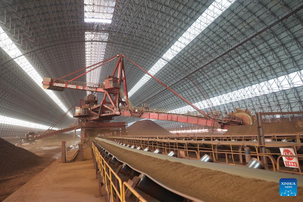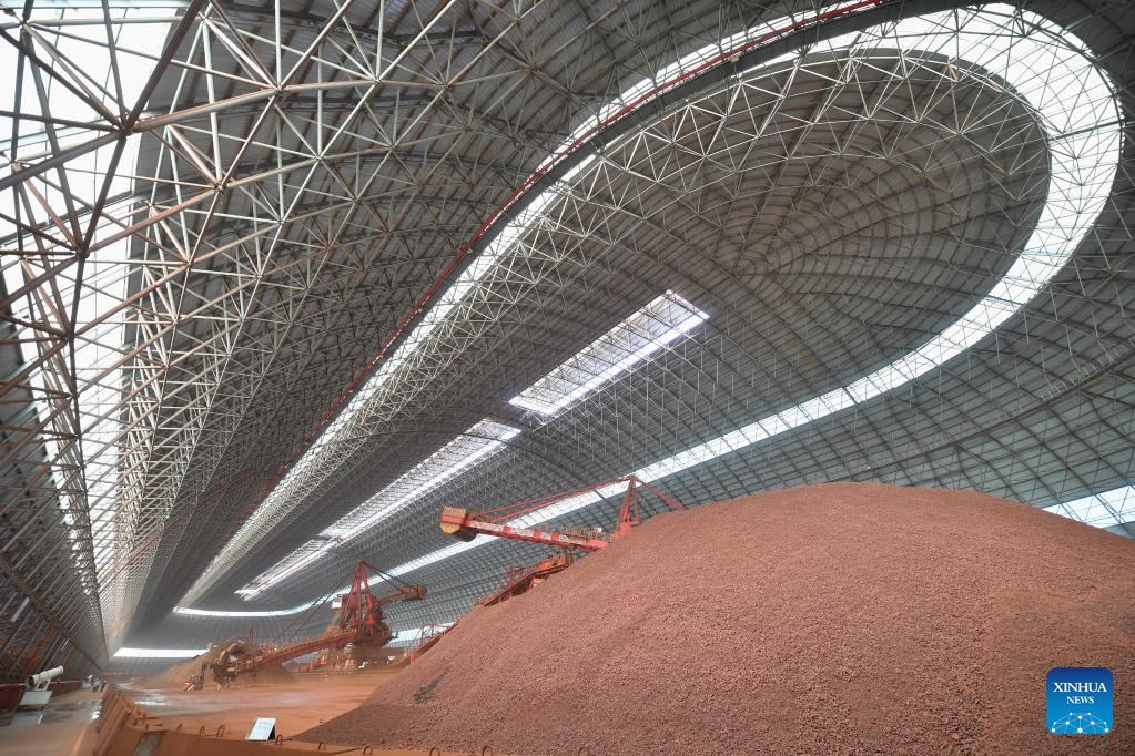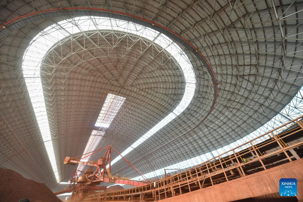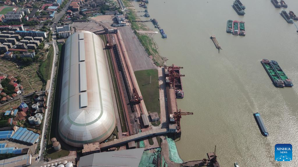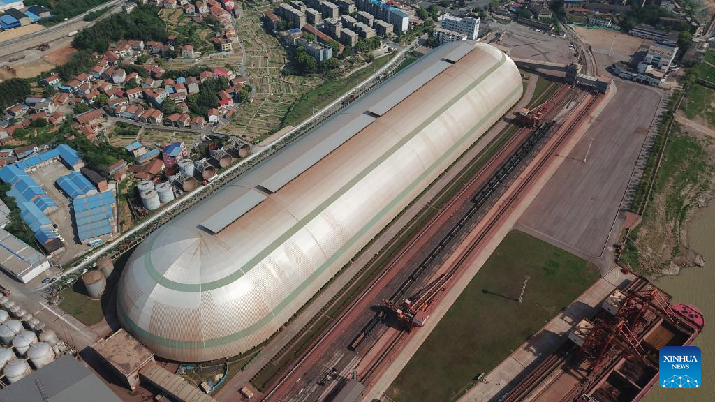 Put into use in 2020 at Chenglingji Port along the Yangtze River, the totally-enclosed warehouse with continuous mist spray inside can effectively help prevent the dust and water pollution previously occurring at the port's freight yard. (Xinhua/Chen Zeguo)