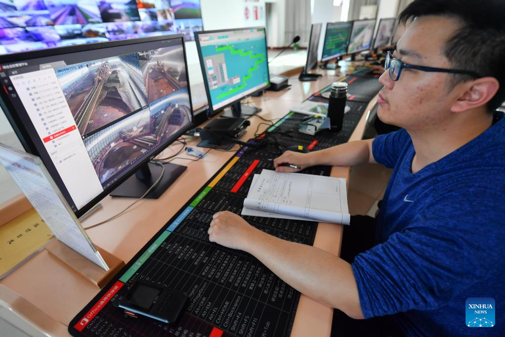 A staff member checks the operation of equipment via cameras at the control center of a capsule-shaped bulk cargo warehouse at Chenglingji Port in Yueyang, central China's Hunan Province, April 17, 2023.