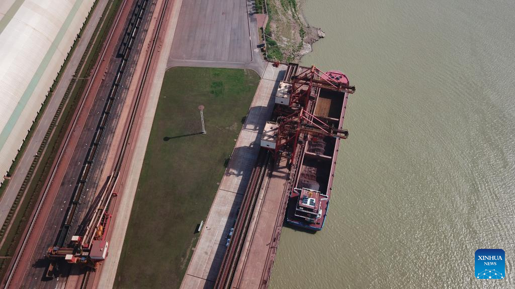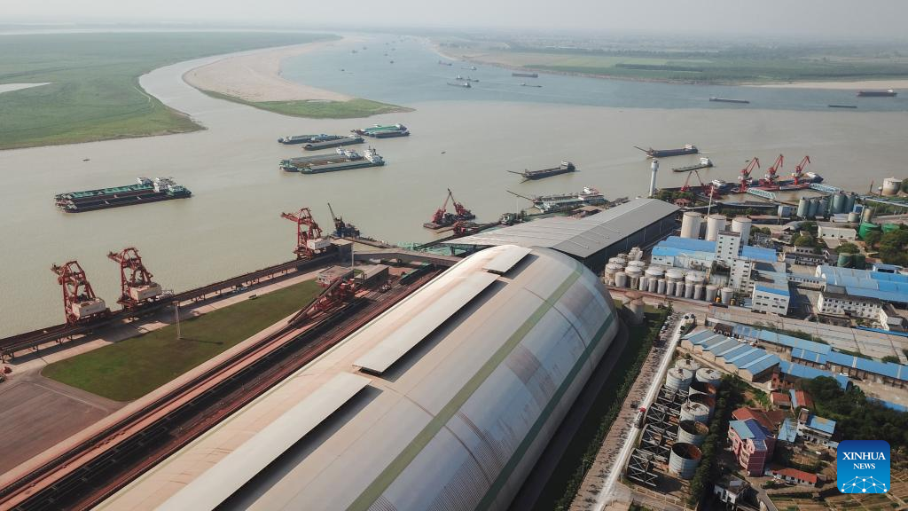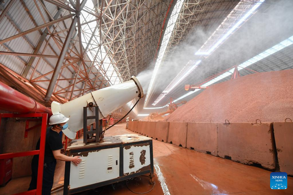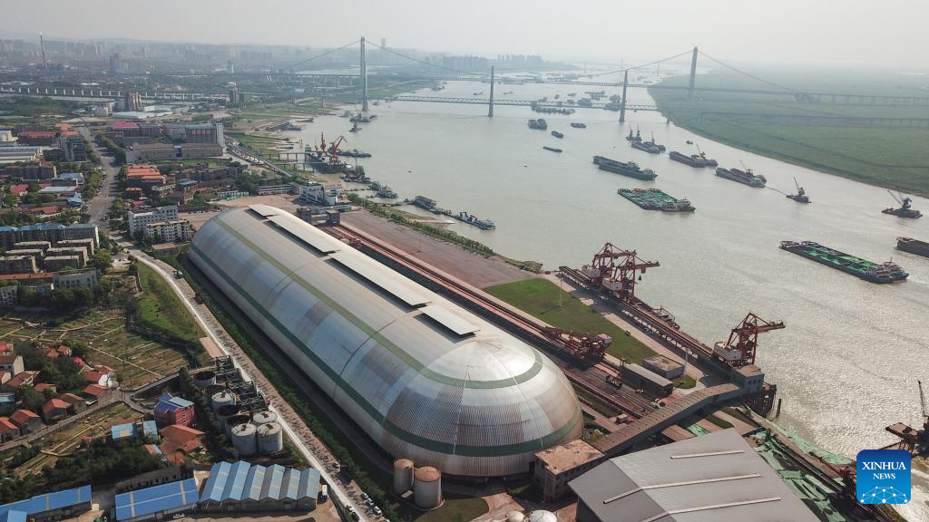 Put into use in 2020 at Chenglingji Port along the Yangtze River, the totally-enclosed warehouse with continuous mist spray inside can effectively help prevent the dust and water pollution previously occurring at the port's freight yard. (Xinhua/Xue Yuge)
