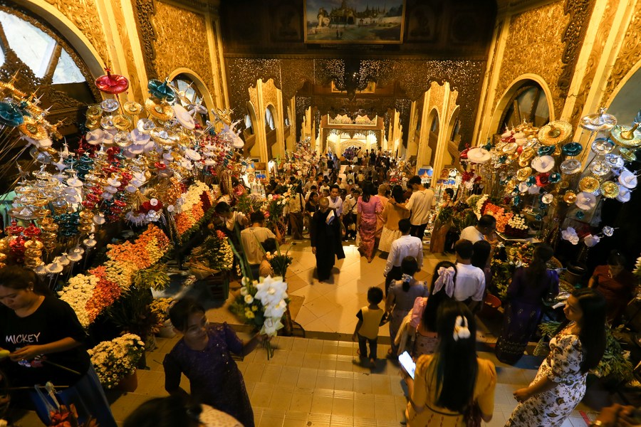 People visit the Shewdagon Pagoda on the first day of the Myanmar calendar New Year in Yangon, Myanmar, April 17, 2023. (Photo by Myo Kyaw Soe/Xinhua)