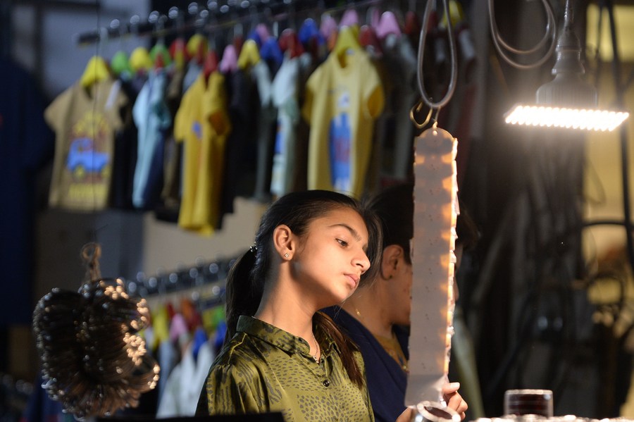 A girl shops at a temporary market built for the Muslim festival Eid al-Fitr in Islamabad, capital of Pakistan on April 16, 2023. (Xinhua/Ahmad Kamal)