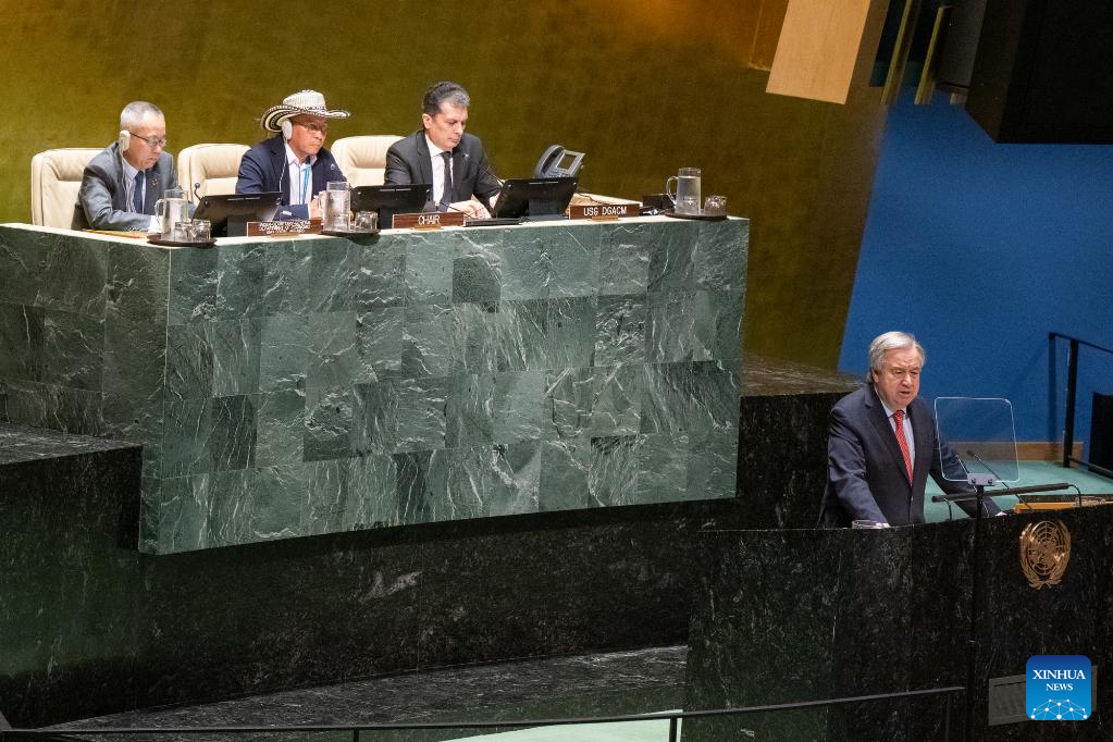 UN Secretary-General Antonio Guterres (at podium) addresses the opening of the 22nd session of the UN Permanent Forum on Indigenous Issues at the UN headquarters in New York, on April 17, 2023. Indigenous Peoples hold many solutions to the climate crisis and the world has much to learn from them, UN Secretary-General Antonio Guterres said on Monday. (Eskinder Debebe/UN Photo/Handout via Xinhua)