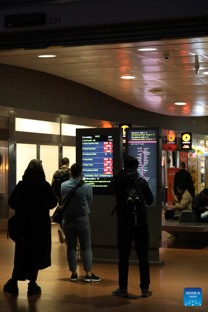 Passengers check electronic timetables at a station in Stockholm, Sweden, April 18, 2023. More than 80 percent of the commuter trains scheduled for Monday evening's rush hour in the Swedish capital were canceled due to a strike by train drivers, local media reported.(Photo by Fang Ming/Xinhua)