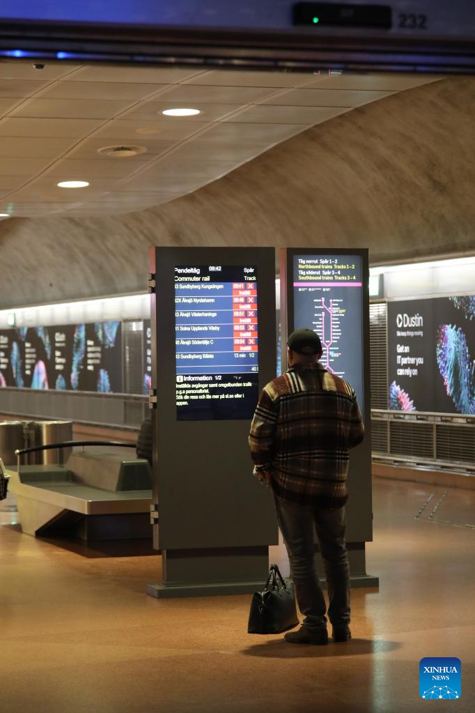 A passenger checks electronic timetables at a station in Stockholm, Sweden, April 18, 2023. More than 80 percent of the commuter trains scheduled for Monday evening's rush hour in the Swedish capital were canceled due to a strike by train drivers, local media reported. (Photo by Fang Ming/Xinhua)