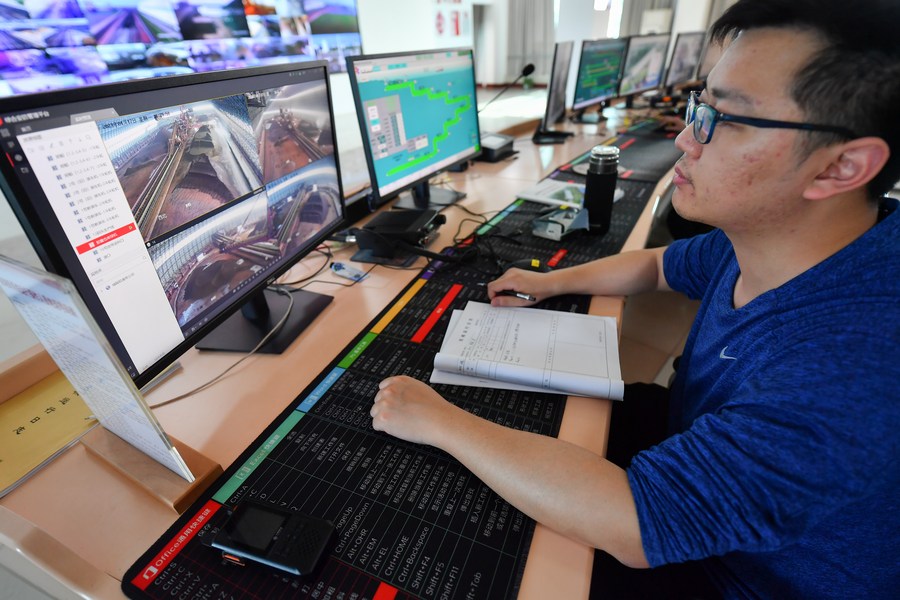 A staff member checks the operation of equipment via cameras at the control center of a capsule-shaped bulk cargo warehouse at Chenglingji Port in Yueyang, central China's Hunan Province, April 17, 2023. (Xinhua/Chen Zeguo)