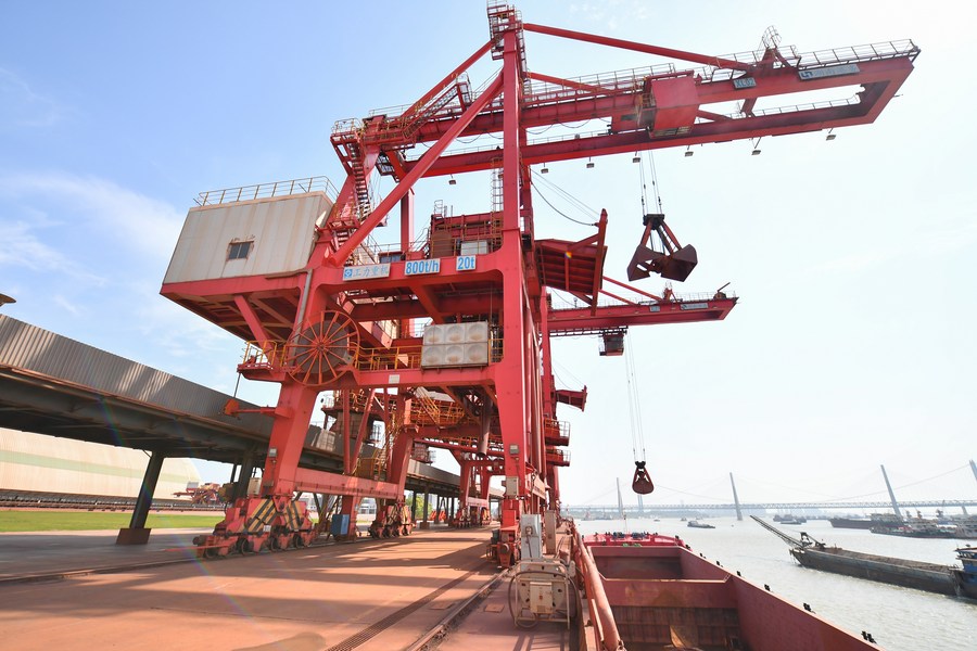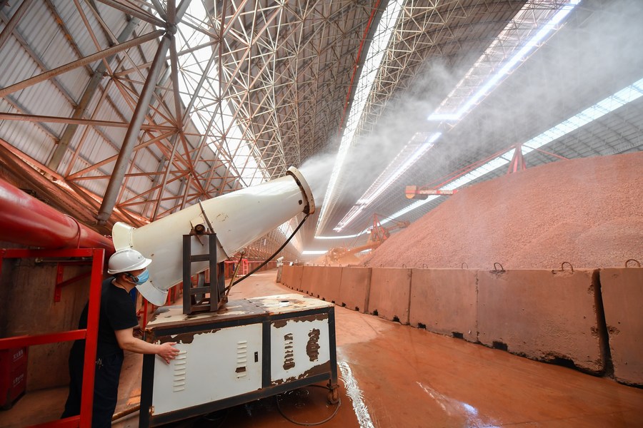 YUEYANG, April 18 (Xinhua) -- Put into use in 2020 at Chenglingji Port along the Yangtze River, the totally-enclosed warehouse with continuous mist spray inside can effectively help prevent the dust and water pollution previously occurring at the port's freight yard.