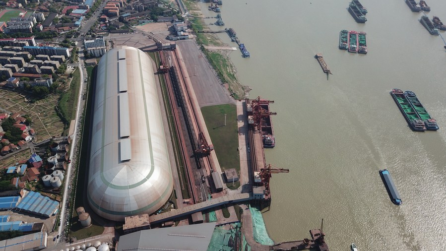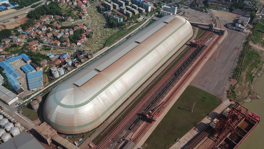 This aerial photo taken on April 17, 2023 shows a capsule-shaped bulk cargo warehouse at Chenglingji Port in Yueyang, central China's Hunan Province. (Xinhua/Chen Zeguo)