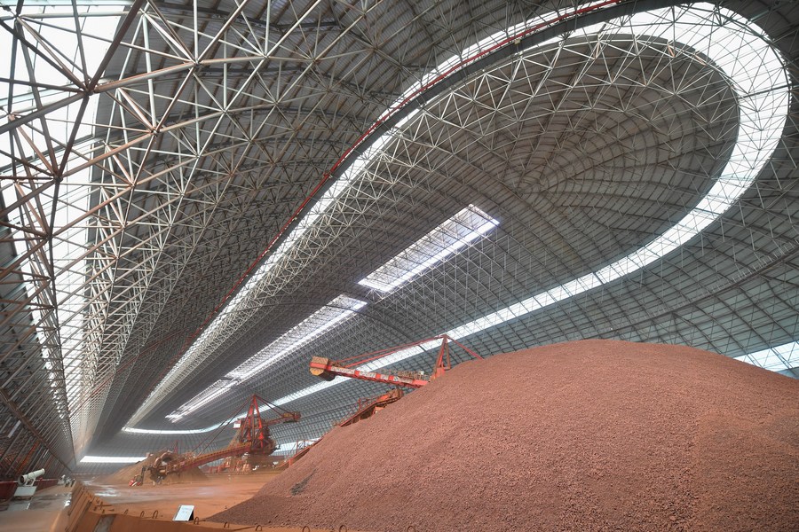 A staff member works inside a capsule-shaped bulk cargo warehouse at Chenglingji Port in Yueyang, central China's Hunan Province, April 17, 2023. (Xinhua/Chen Zeguo)