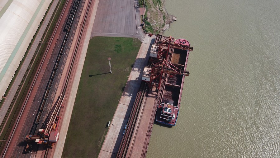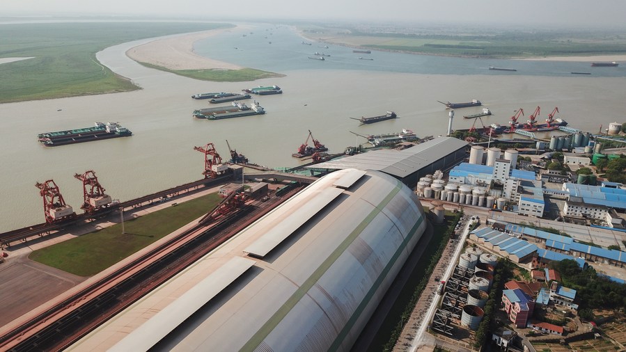 This aerial photo taken on April 17, 2023 shows cargo being transported through a conveyor belt into a capsule-shaped bulk cargo warehouse at Chenglingji Port in Yueyang, central China's Hunan Province. (Xinhua/Xue Yuge)