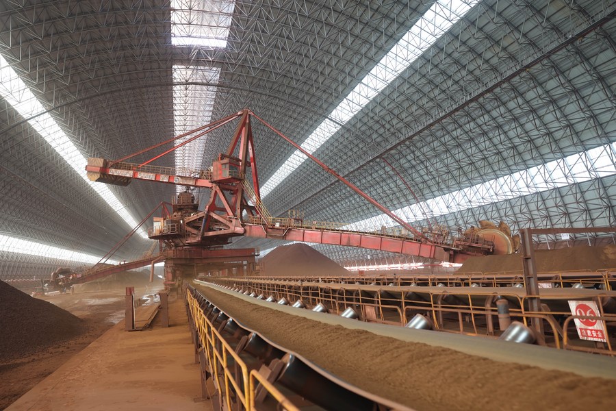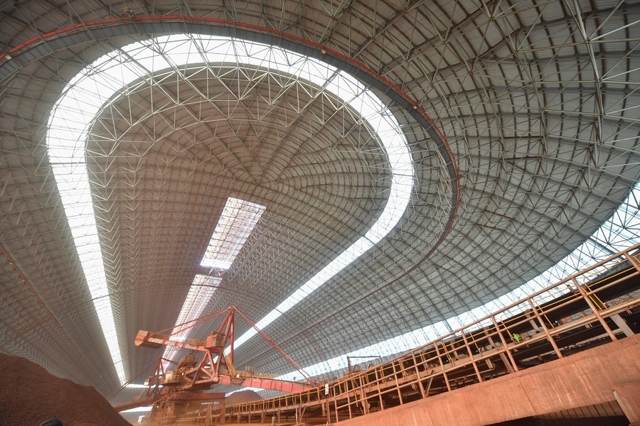 Cargo is transported through a conveyor belt inside a capsule-shaped bulk cargo warehouse at Chenglingji Port in Yueyang, central China's Hunan Province, April 17, 2023. (Xinhua/Xue Yuge)
