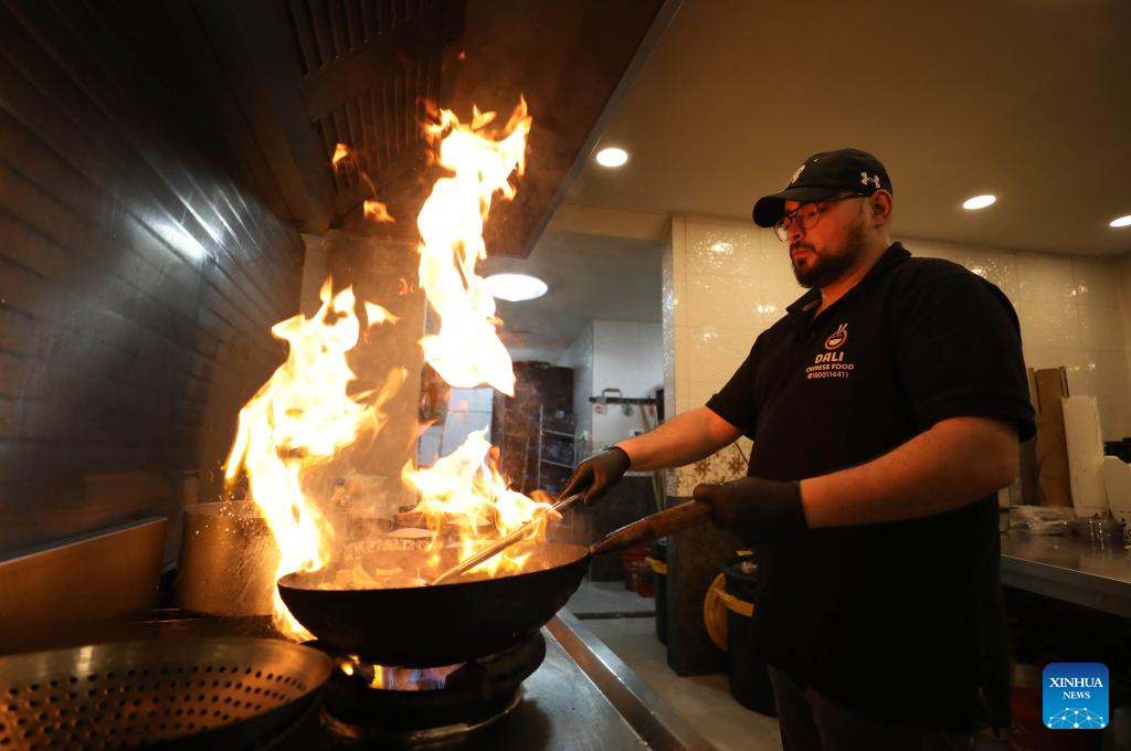 Palestinian chef Amir al-Dali prepares Chinese dishes at a restaurant in the West Bank city of Ramallah, on April 9, 2023. (Photo by Ayman Nobani/Xinhua)