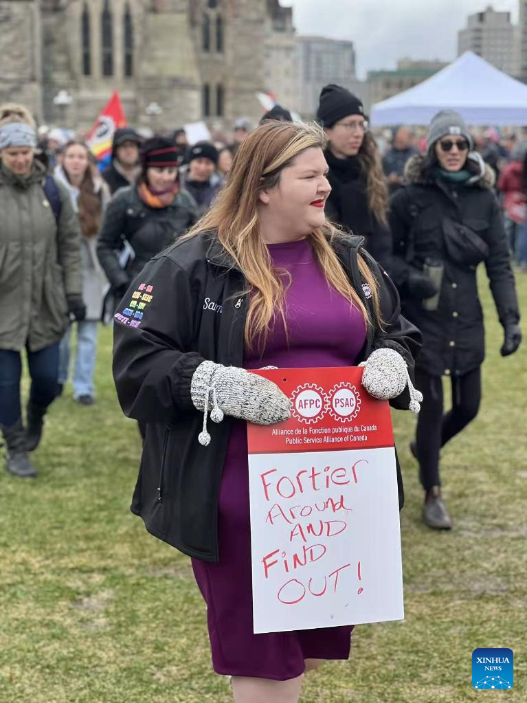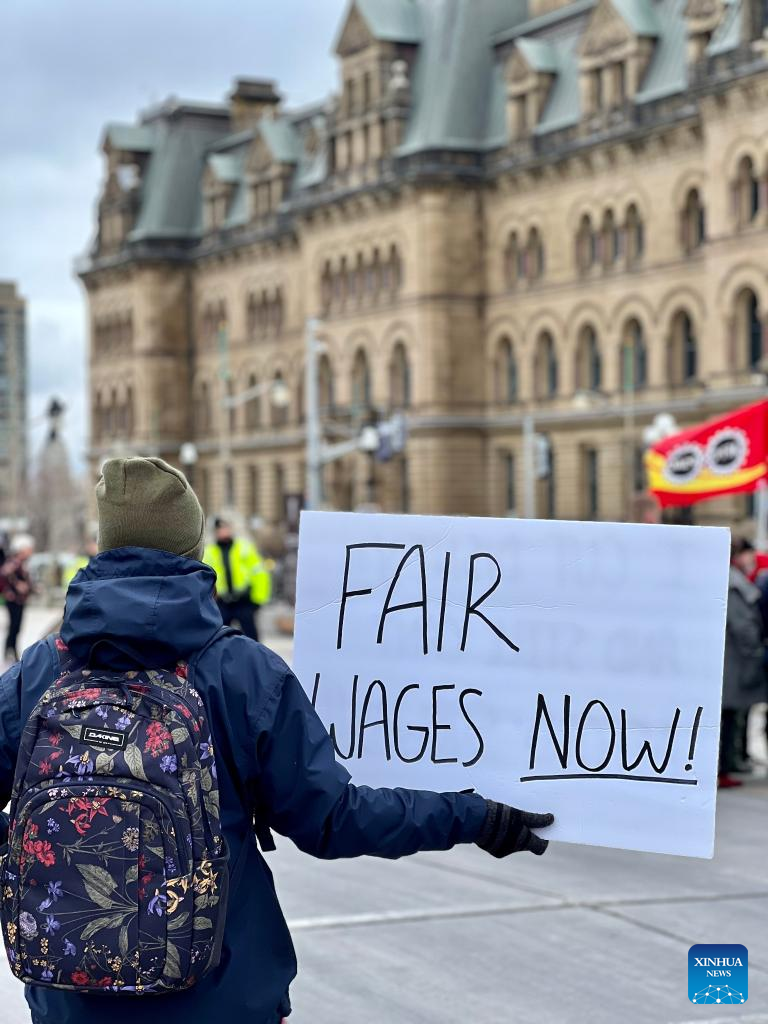 A member of the Public Service Alliance of Canada (PSAC) demonstrates on Parliament Hill in Ottawa, Canada, on April 19, 2023. Canada's largest federal public service union announced Tuesday night that more than 155,000 workers will go on strike, setting the stage for one of the largest strikes in Canada's history. The Public Service Alliance of Canada (PSAC) said in a news release that the strike action taken by its members working for Treasury Board and Canada Revenue Agency would begin Wednesday. (Photo by Min Chen/Xinhua)