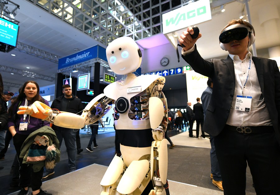 An intelligent robot imitates the gesture of a man during the Hannover Messe in Hannover, Germany, on April 18, 2023. Germany's leading trade fair for mechanical and electrical engineering kicked off on Monday in Hannover, with the theme of "Industrial Transformation - Making the Difference." (Xinhua/Ren Pengfei)■