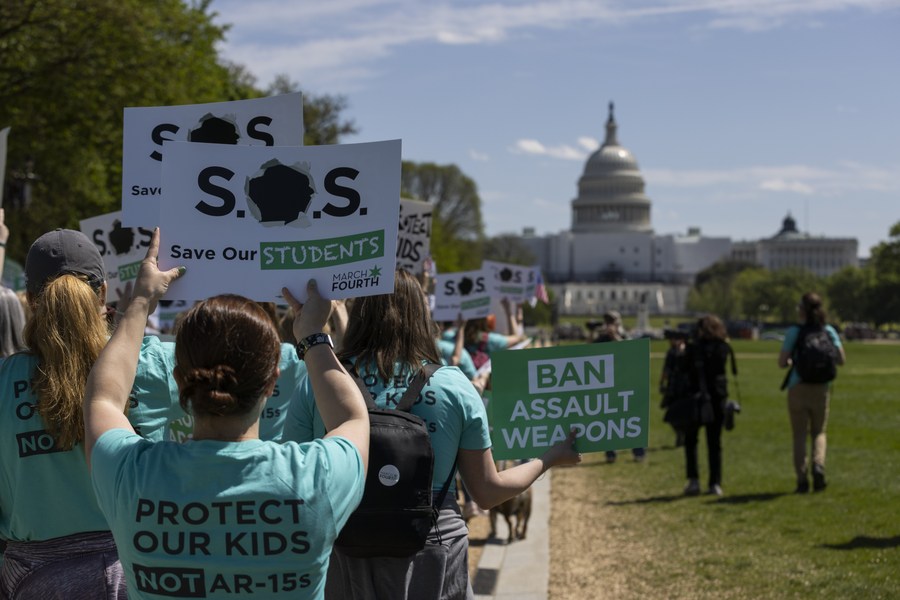 People march to the Capitol to protest for a ban on assault weapons, in Washington, D.C., the United States, on April 17, 2023. Four people were killed and at least 28 others injured in a shooting at a birthday party on Saturday night in the small Alabama town of Dadeville, the United States, authorities said Sunday. This incident took the United States to a bleak milestone of more than 160 mass shootings so far this year, with 12,277 deaths from gun violence, according to a database run by the nonprofit research group Gun Violence Archive. (Photo by Aaron Schwartz/Xinhua)