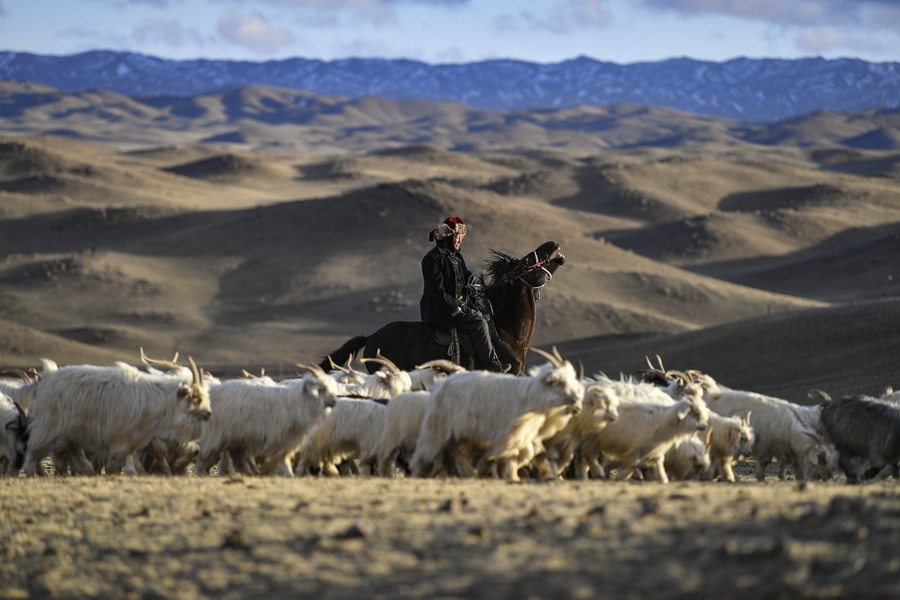 A herdsman herds his sheep on the spring pasture in Yumin County, northwest China's Xinjiang Uygur Autonomous Region, April 12, 2023. (Xinhua/Hu Huhu)
