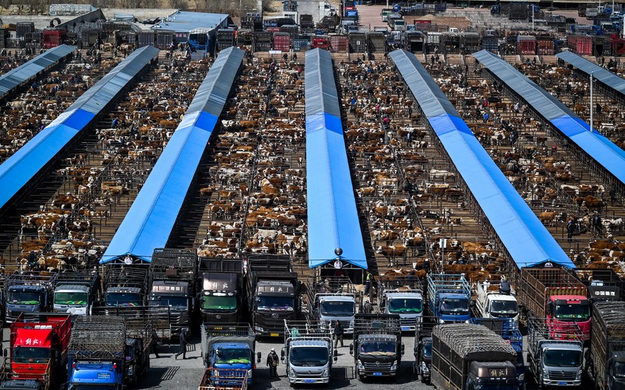This photo taken on April 12, 2023 shows a livestock market in Horqin Left Wing Middle Banner of Tongliao City in north China's Inner Mongolia Autonomous Region. Thanks to efforts towards scale and standardized operation, the beef cattle industry in Tongliao has seen brisk growth, boasting an annual beef cattle population of more than 3 million. (Xinhua/Lian Zhen)