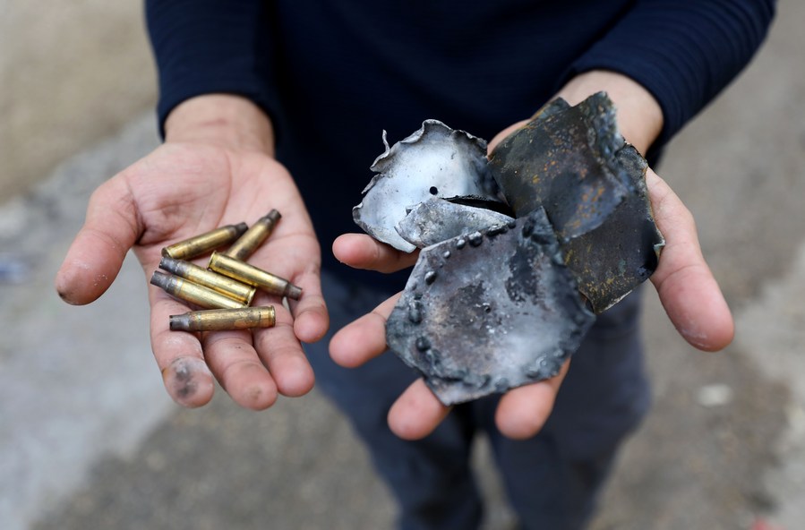 A man shows cartridge casings and shrapnel in a refugee camp of Jenin in the northern West Bank, on April 18, 2023. At least eight Palestinians were shot and injured on Tuesday during clashes with Israeli soldiers in a refugee camp of Jenin, Palestinian Health Ministry said in a statement. (Photo by Ayman Nobani/Xinhua)