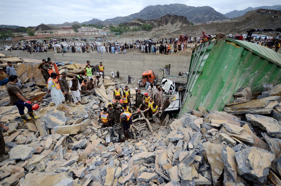 Rescuers search for victims at a landslide site in northwest Pakistan's Torkham on April 18, 2023. Eight people were injured and scores of others went missing under the rubbles following a land sliding at the Torkham border in Pakistan's northwest Khyber Pakhtunkhwa province on Tuesday, rescue sources said. (Str/Xinhua)