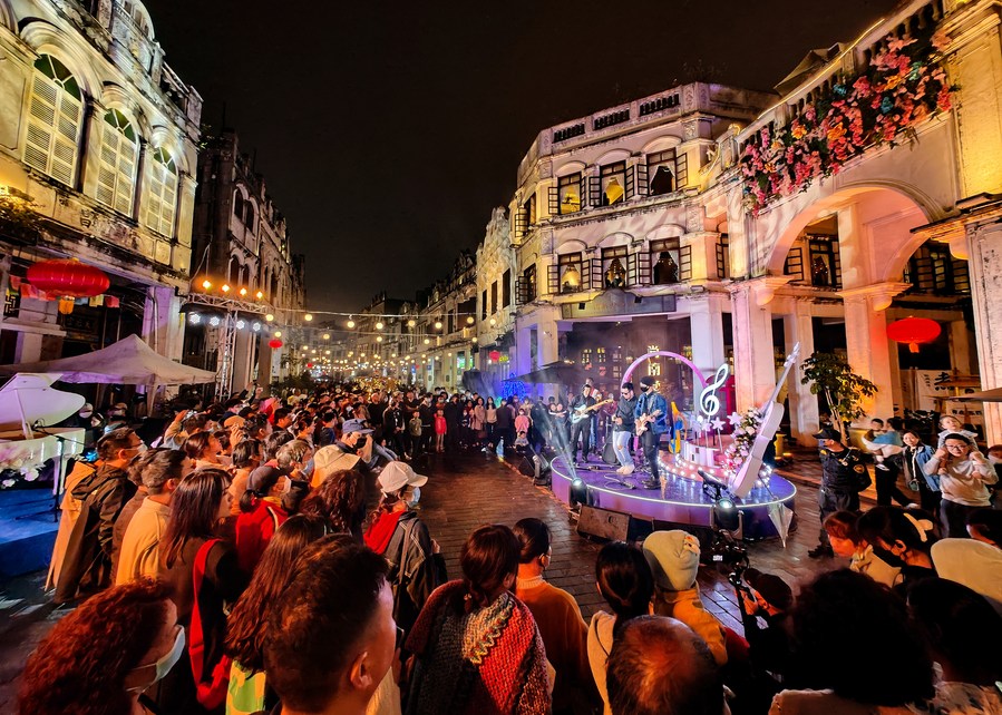 Tourists watch as a live band performs at a street market in Haikou, south China's Hainan Province, Feb. 3, 2023. (Xinhua/Guo Cheng)