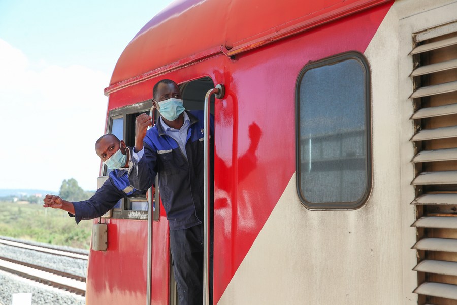 Kenyan drivers John Pius (L) and Brian Kemboi confirm safety with platform staff at Ngong station in Kajiado, Kenya, March 25, 2022. (Xinhua/Long Lei)