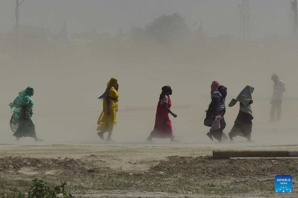 People walk amid a dust storm in Prayagraj district of India's northern state of Uttar Pradesh April 18, 2023. (Str/Xinhua)