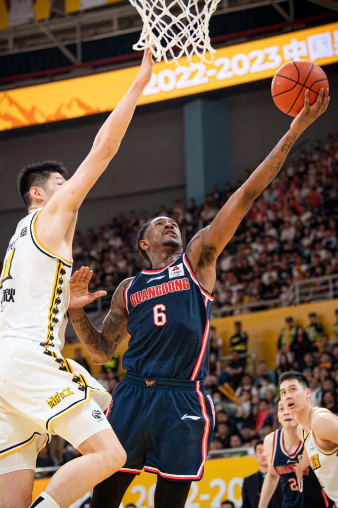Marshon Brooks (R) of Guangdong Southern Tigers goes for a lay-up during the Game 2 of the best-of-three quarterfinals between Zhejiang Lions and Guangdong Southern Tigers at the playoffs of 2022-2023 season of the Chinese Basketball Association (CBA) league in Hangzhou, east China's Zhejiang Province, April 20, 2023. (Xinhua/Jiang Han)