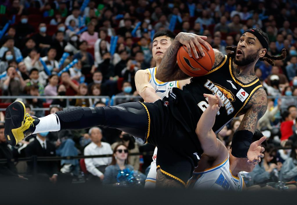 (230420) -- BEIJING, April 20, 2023 (Xinhua) -- Eric Moreland (C) of Liaoning Flying Leopards competes during the Game 2 of the best-of-three quarterfinals between Beijing Ducks and the Liaoning Flying Leopards at the playoffs of 2022-2023 season of the Chinese Basketball Association (CBA) league in Beijing, capital of China, April 20, 2023. (Xinhua/Wang Lili)