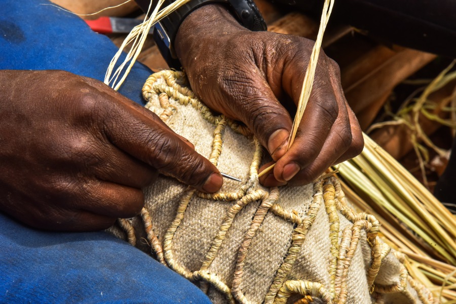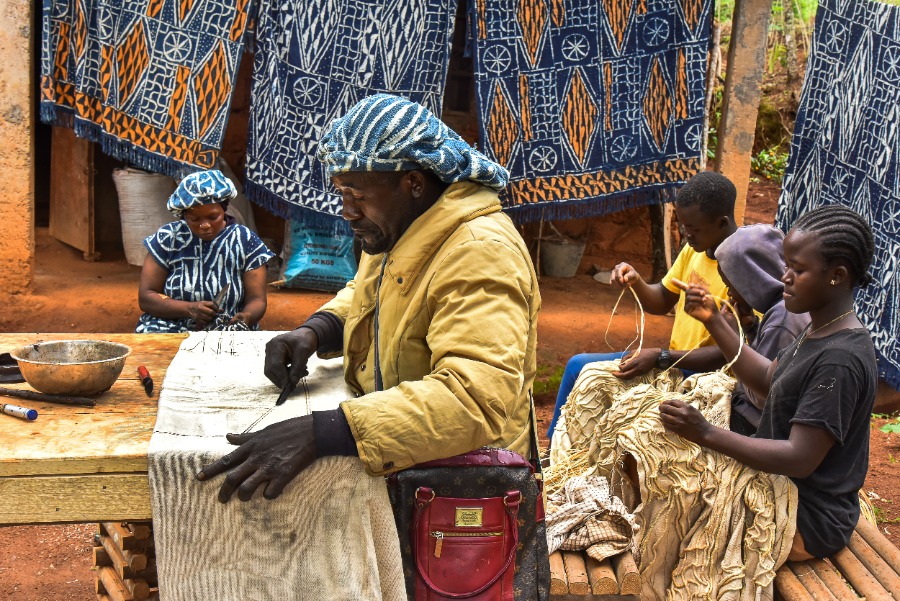 A craftsman works on an Ndop design with raffia fibers at a workshop in Baham, Cameroon, April 11, 2023. (Xinhua/Kepseu)