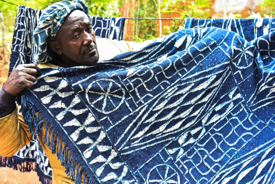 A craftsman shows a piece of traditional Ndop fabric at a workshop in Baham, Cameroon, April 11, 2023. (Xinhua/Kepseu)